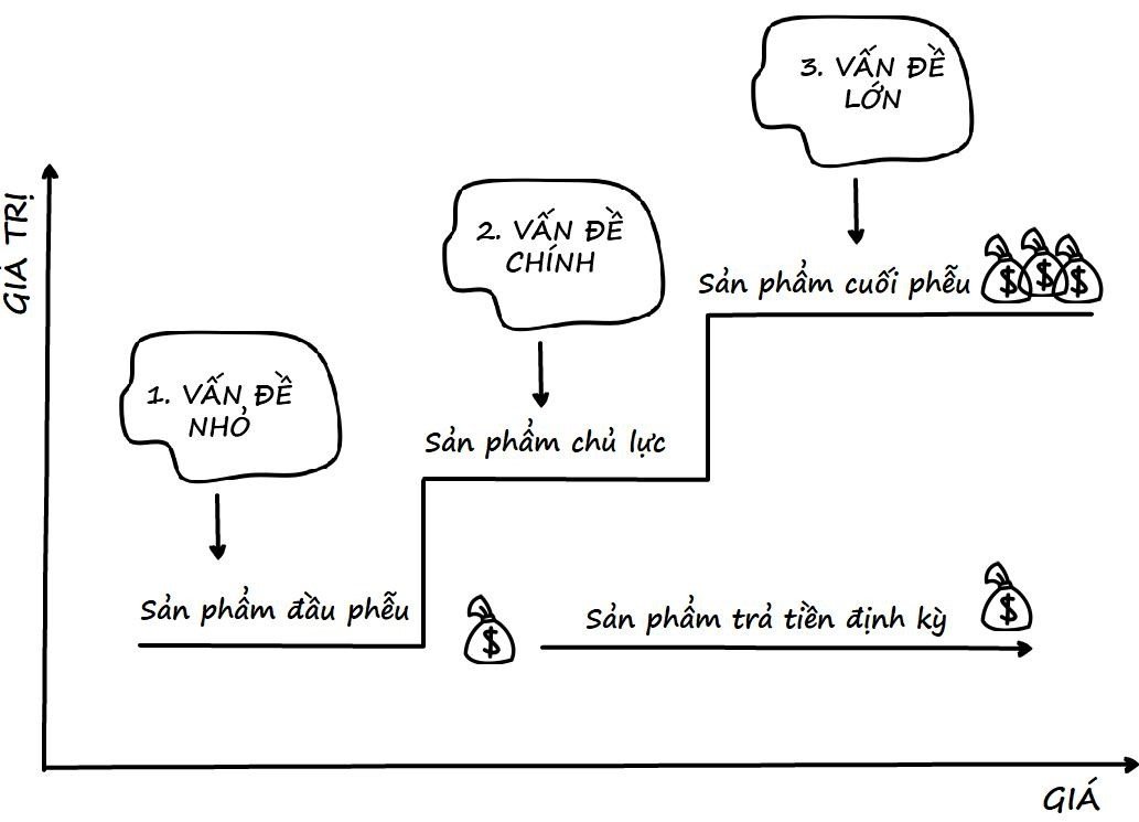 Khi nghĩ đến việc tạo ra sản phẩm kinh doanh, bạn luôn phải nghĩ nó theo thang giá trị từ thấp đến cao. Khiến cho khách hàng mua những sản phẩm đầu phễu sẽ giúp họ gắn kết bước đầu với bạn để có kết quả, sau đó họ sẽ tiếp tục leo lên những nấc thang giá trị với những sản phẩm khác nhau mà bạn chào bán.